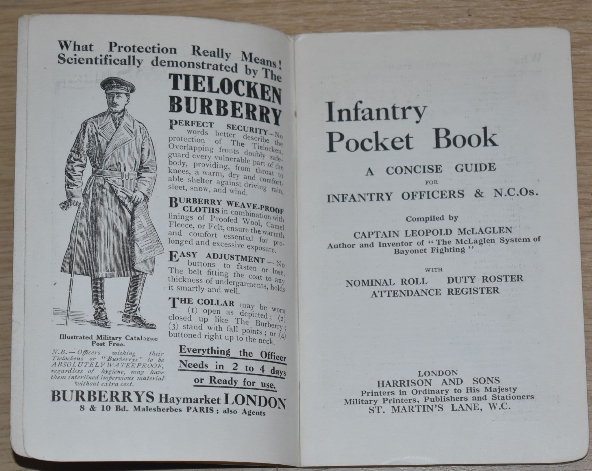 The author was an interesting man - a self proclaimed Ju-Jitsu champion, he wrote one of the earliest self defence books in 1918 - 'Ju-Jitsu, A Manual of the Science', and he lectured and taught police forces in the British Empire. Another of his books, as noted on the cover of this booklet, was 'Bayonet Fighting for War'. In this booklet, he has written a guide for British infantry officers, and as well as adverts from the time, there are sections on General Duties, Field Training, Musketry, Camp Duties and Medical. So if you want to know the procedure for striking tents, posting sentries, trigger pressing, care of arms, march discipline, road spaces, and more, all from the time of the First World War, this is the guide for you!