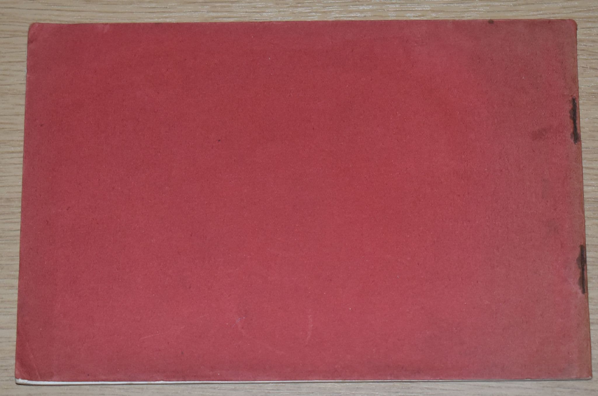 The condition of the booklet is very poor. The red card covers have several minor scuffs and blemishes, and light creasing and wear along the edges and corners, but the staple spine is intact and all pages are intact and bound. The booklet has become exposed to damp along the top edge, and this has caused the red colouring from the covers to bleed along the top edge of the first 20 or so pages, and there is staining, discoloration and further wear and damage along the top edge of the inside pages throughout.